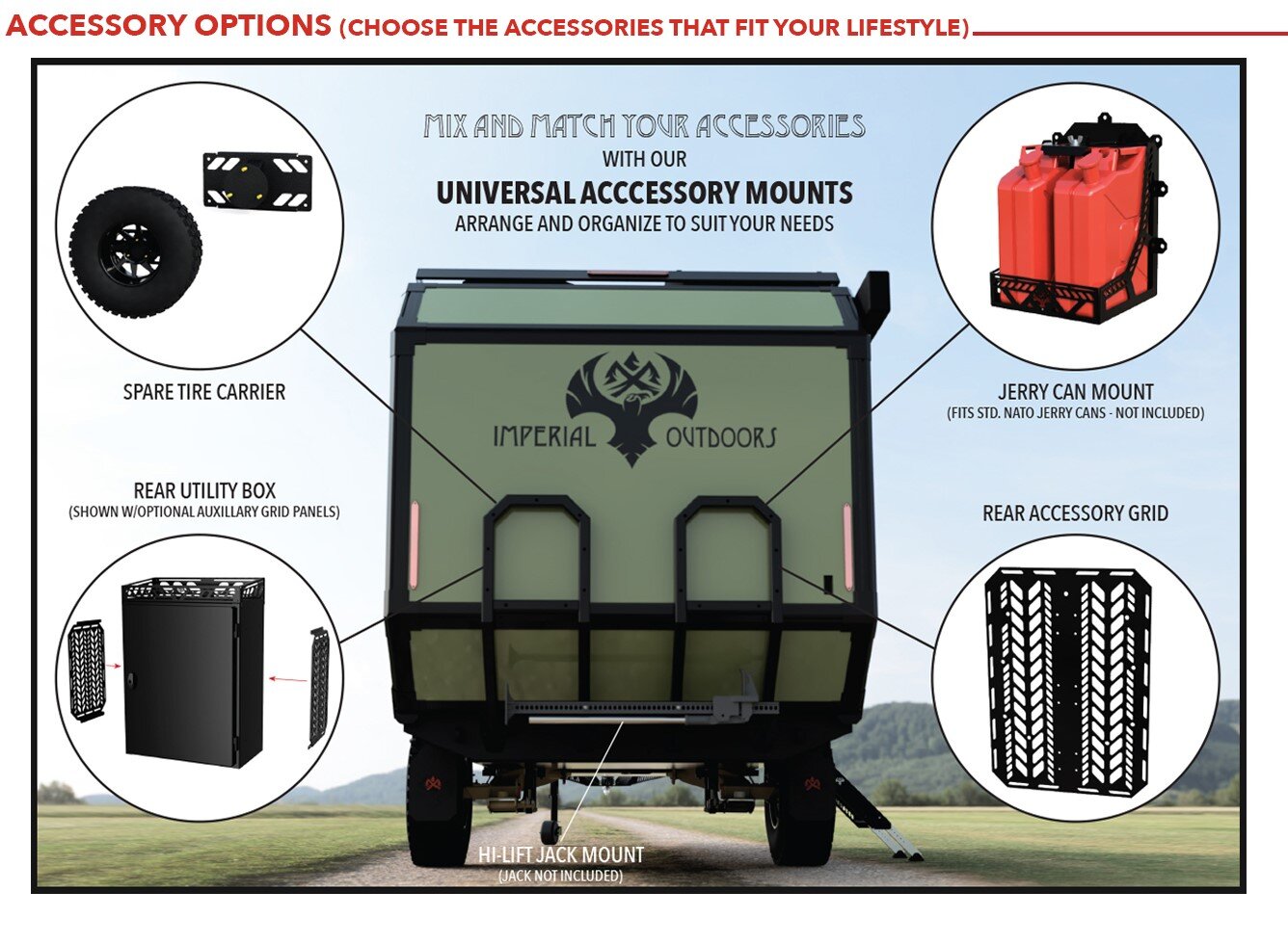 The X195 comes with universal accessory mounts that allow you to mix and match the accessories so you can alter your setup to match the adventure! Accessory options include a Spare Tire Carrier, Jerry Can Mount, Rear Utility Box and Accessory Grids. By the way, a 2200W Honda Generator fits perfectly into the Rear Utility Box. Now this isn’t an infomertial….”But Wait! THERE’S MORE!”. The exterior extrusions are designed with T-Track Mounts. Get creative! Mount a clothes line, Hi-Lift Jack, tools — the limits of functionality are up to you!