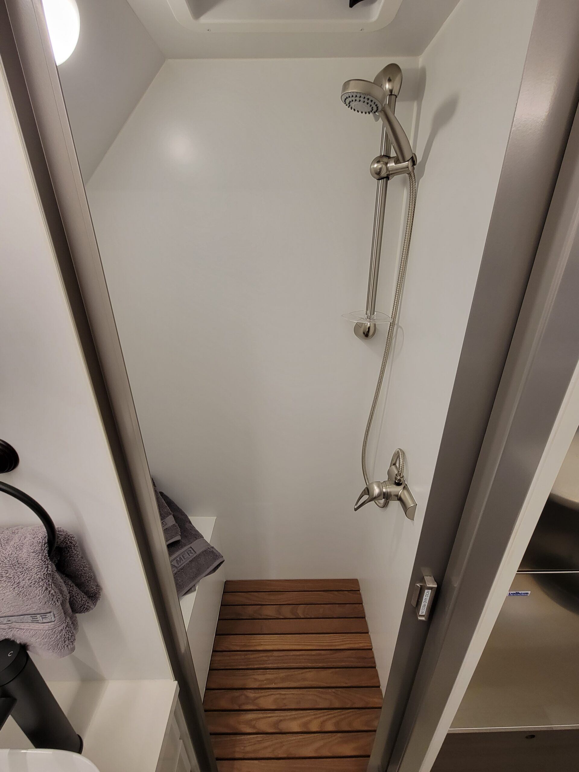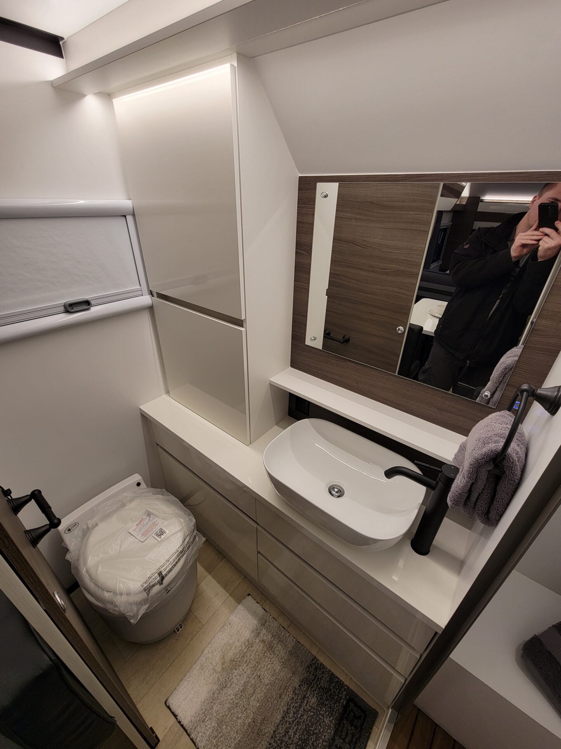 The Bathroom is splendid. We put a 6 foot, 200+ pound guy in here and he had all the room he needed to do his business. Not just that but there is actually quite a bit of space for all your toiletries and shower supplies. They really paid attention to details too. For example, when you close the door, it puts the toilet paper roll right at an easy to reach height just in front of you and to the right. Little details like that really shows you that they were thinking about the user.