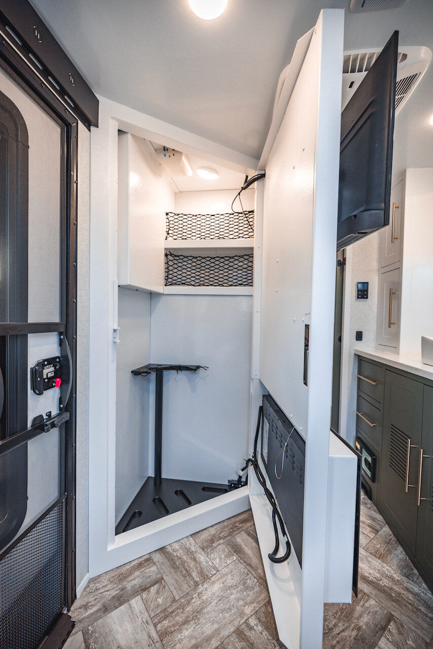 There is also an enormous safe, hidden behind the TV. What I mean by enormous is that you can fit a 6″2′ man that is over 200 pounds inside with a bit of space to spare. I’ve never seen such a large hidden safe on a trailer.